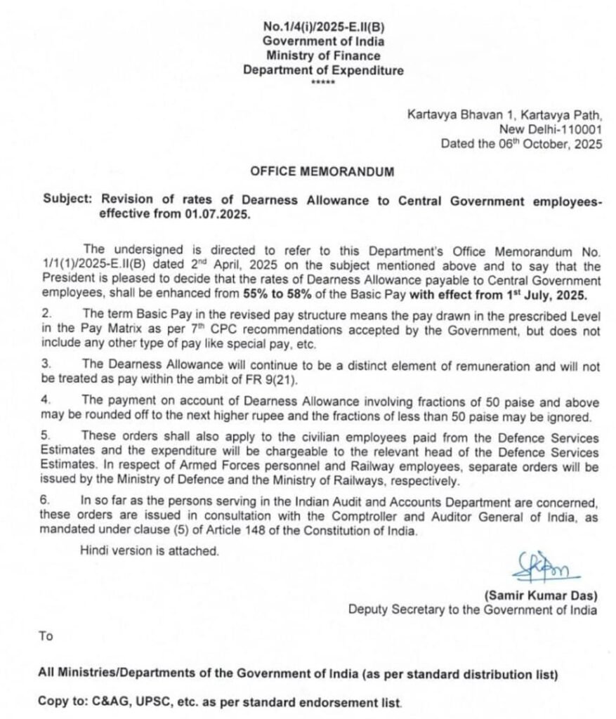 केंद्र सरकारी कर्मचाऱ्यांना सातवा वेतन आयोगानुसार देय असणाऱ्या डी.ए चे दर दिनांक 01.07.2025 पासुन मुळ वेतनाच्या 55 टक्के वरुन 58 टक्के करण्याचा निर्णय केंद्र सरकारकडून घेण्यात आलेला आहे .