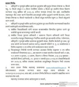 अतिवृष्टी , पुर यामुळे बाधित कुटुंबांना ( 10 किलो – गहु , तांदुळ , 5 लिटर केरोसिन , 3 किलो तुर .. ) मदत GR दि.30.09.2025