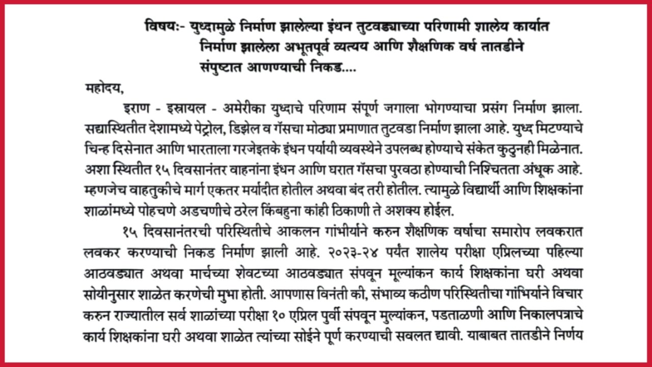 युद्धजन्य स्थितीमुळे शाळांना लवकरच सुट्टी देण्याचे पत्र ..दि.26.03.2026