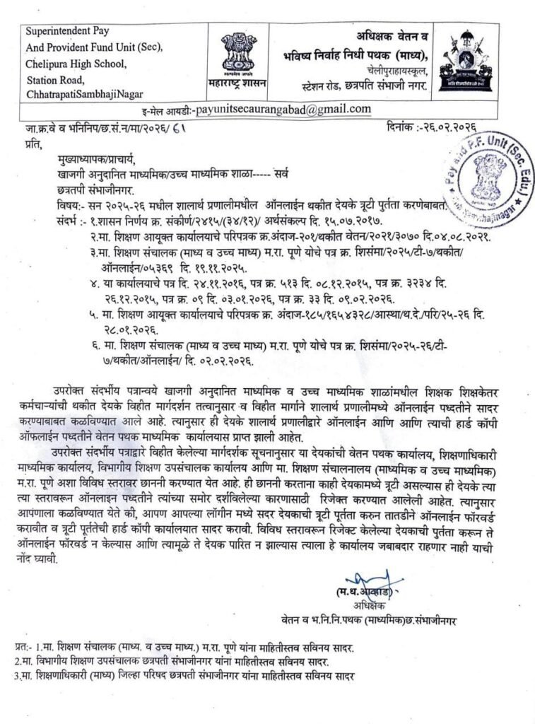 Mh-Tv@24 संगिता पवार प्रतिनिधी [ Circular regarding rectification of outstanding payments in the year 2025-26 dated 26.02.2026 ] : सन 2025-26 मधील शालार्थ प्रणालीमधील ऑनलाईन थकीत देयके त्रुटी पुर्तता करणेबाबत , अधिक्षक वेतन व भविष्य निर्वाह पथक ( माध्य ) यांच्यामार्फत दि.26.02.2026 रोजी महत्वपुर्ण परिपत्रक निर्गमित करण्यात आलेला आहे .