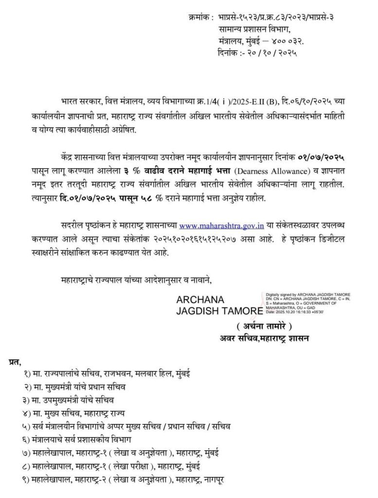 तसेच त्यानुसार दिनांक 01.07.2025 पासुन 58 टक्के दराने महागाई भत्ता अनुज्ञेय करण्यात आलेला आहे .