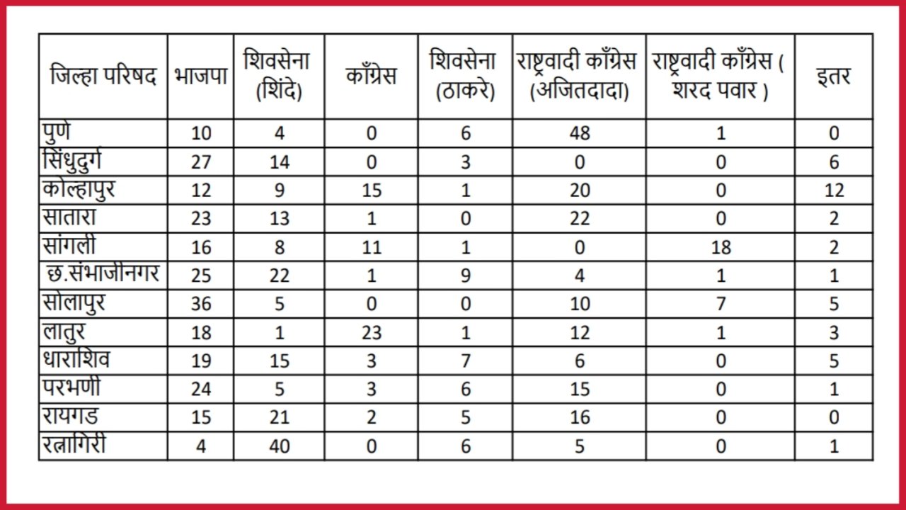 | जिल्हा परिषद | भाजपा | शिवसेना (शिंदे) | काँग्रेस | शिवसेना (ठाकरे) | राष्ट्रवादी काँग्रेस (अजितदादा) | राष्ट्रवादी काँग्रेस ( शरद पवार ) | इतर |