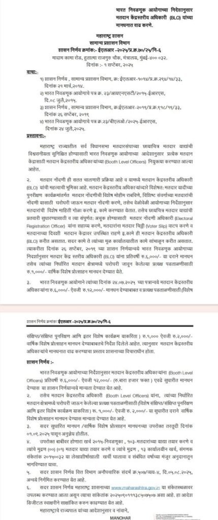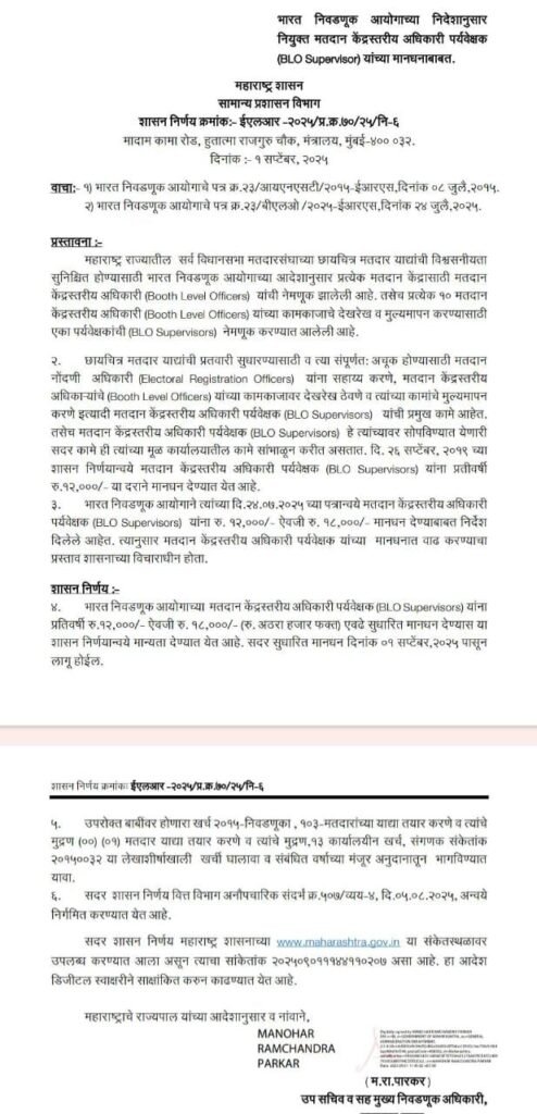 Mh-Tv@24 प्रणिता पवार प्रतिनिधी : केंद्र सरकारच्या निदेशानुसार मतदान यंत्रणा अंतर्गत काम करणाऱ्या अधिकारी कर्मचाऱ्यांच्या मानधनांमध्ये वाढ करणे संदर्भात दोन महत्त्वपूर्ण शासन निर्णय (GR) दिनांक 1 सप्टेंबर 2025 रोजी निर्गमित करण्यात आलेले आहे .