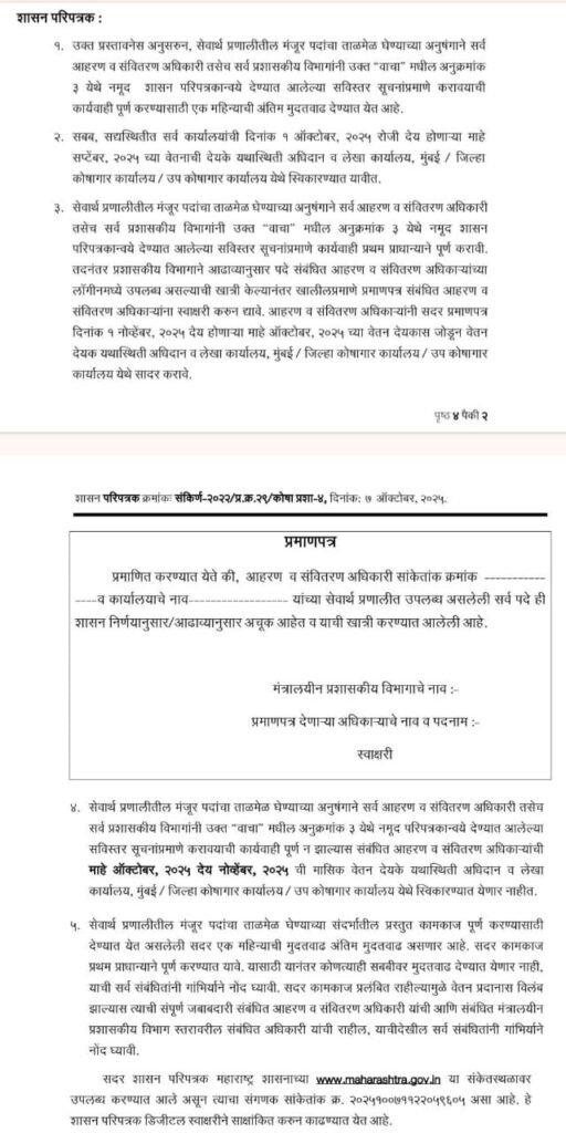 प्रमाणपत्रांमध्ये सर्व पदे ही शासन निर्णयानुसार / आढाव्यानुसार अचुक आहेत याची खात्री करण्यात आलेली आहे असे प्रमाणपत्र सादर करावे लागणार आहे . याशिवाय माहे ऑक्टोंबर पेड इन नोव्हेंबरचे वेतन आहरित करण्यात येणार नाहीत .