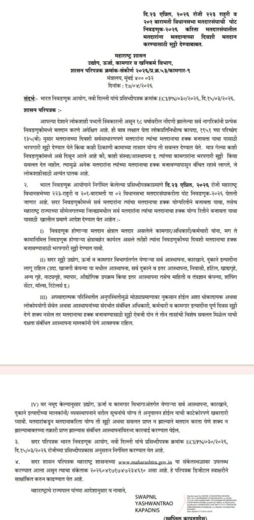 सदर निर्णयानुसार नमुद करण्यात आले आहेत कि , भारत निवडणुक आयोगाने निर्गमित केलेल्या प्रसिद्धीपत्रकानुसार , दि.23.04.2026 रोजी महाराष्ट्र विधानसभेच्या 223 राहुरी व 201 – बारामती या 02 विधानसभा मतदार संघातील पोट निवडणूक 2026 घेतली जाणार आहे .