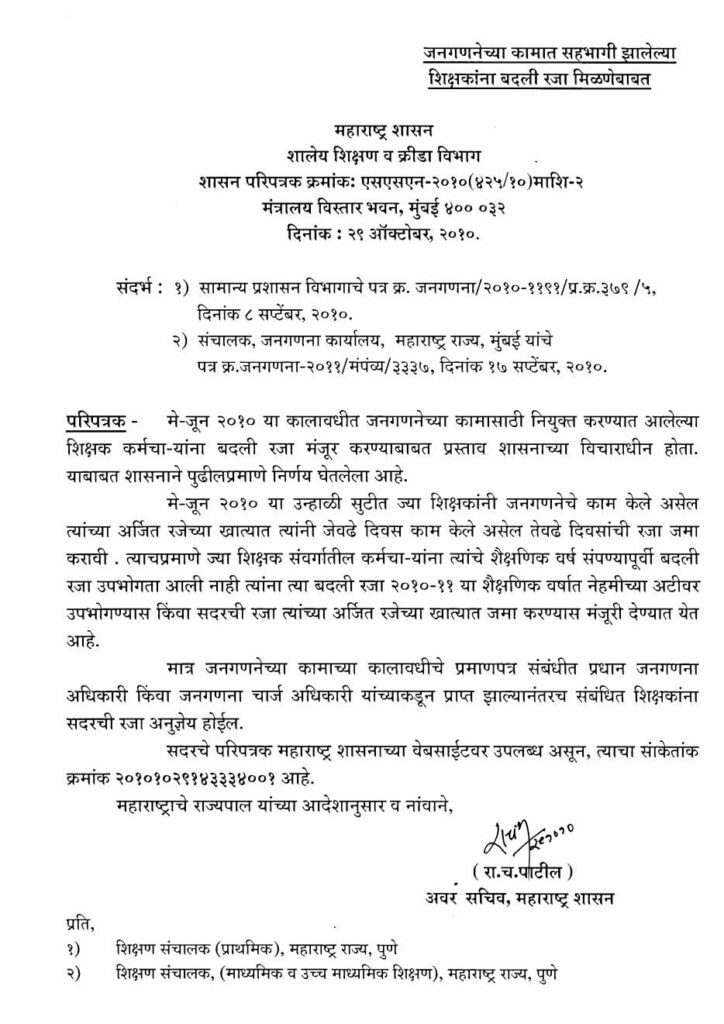 मात्र जनगणनेच्या कामाच्या कालावधीचे प्रमाणपत्र संबंधित प्रधान जनगणना अधिकारी अथवा जनगणना चार्ज अधिकारी यांच्याकडून प्राप्त झाल्यानंतरच संबंधित शिक्षकांना सदरची रजा अनुज्ञेय होईल अशी बाब नमुद करण्यात आली आहे .