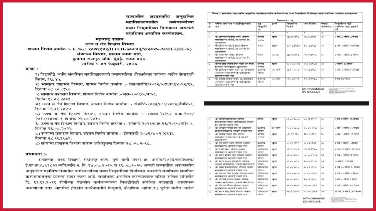 Mh-Tv@24 संगिता पवार प्रतिनिधी [ GR issued on 09.02.2026 regarding waiver of age limit on the date of first appointment of employees. ] : कर्मचाऱ्यांच्या प्रथम नियुक्तीच्या दिनांकास असणारे वयाधिक्य क्षमापित करणेबाबत उच्च व तंत्र शिक्षण विभाग मार्फत दि.09.02.2026 रोजी महत्वपुर्ण शासन निर्णय निर्गमित करण्यात आलेला आहे .