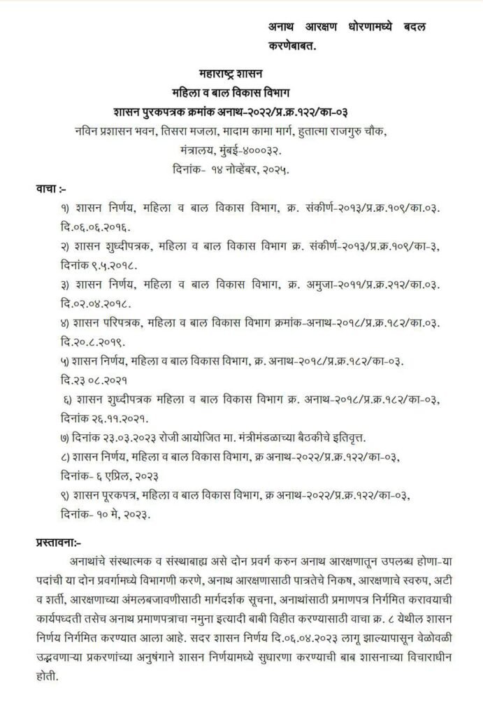 Mh-Tv@24 संगिता पवार प्रतिनिधी [ GR issued on 14.11.2025 regarding changes in Orphan Reservation Policy ] : अनाथ आरक्षण धोरण मध्ये बदल करणेबाबत महिला व बाल विकास विभाग मार्फत दिनांक 14.11.2025 रोजी महत्वपुर्ण शासन निर्णय निर्गमित करण्यात आला आहे .