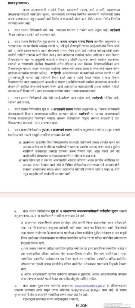 तसेच अनाथ आरक्षण करीता सुयोग्य उमेदवार उपलब्ध न झाल्यास , अनाथ आरक्षण करीता उपलब्ध करुन देण्यात आलेले पद हे केवळ त्या जाहिरातीपुरते मर्यादित राहील असे नमुद करण्यात आले आहेत .