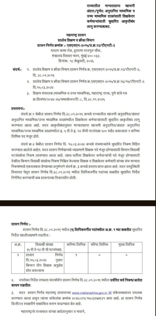Mh-Tv@24 संगिता पवार प्रतिनिधी [ GR issued on 18.02.2026 regarding implementation of revised structure for non-teaching staff for schools in the state ] : राज्यातील शाळांसाठी शिक्षकेत्तर कर्मचाऱ्यांकरीता सुधारित आकृतीबंध लागु करणेबाबत शालेय शिक्षण व क्रिडा विभाग मार्फत दि.18.02.2026 रोजी महत्वपुर्ण शासन निर्णय निर्गमित करण्यात आलेला आहे .