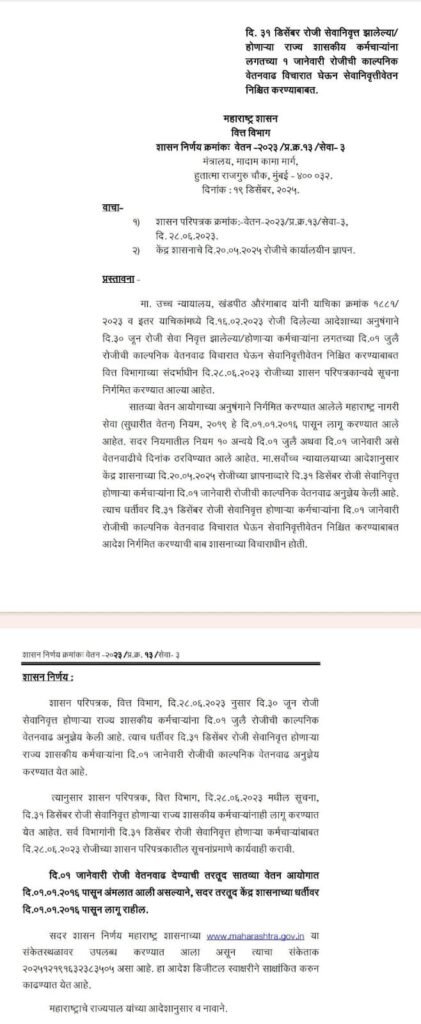 Mh-Tv@24 संगिता पवार प्रतिनिधी [ GR issued on 19.12.2025 regarding determination of pension to state employees taking into account hypothetical salary increment ] : राज्य कर्मचाऱ्यांना काल्पनिक वेतनवाढ विचारात घेवून निवृत्तीवेतन निश्चित करणेबाबत , वित्त विभाग मार्फत दिनांक 19.12.2025 रोजी महत्वपुर्ण शासन निर्णय निर्गमित करण्यात आला आहे .