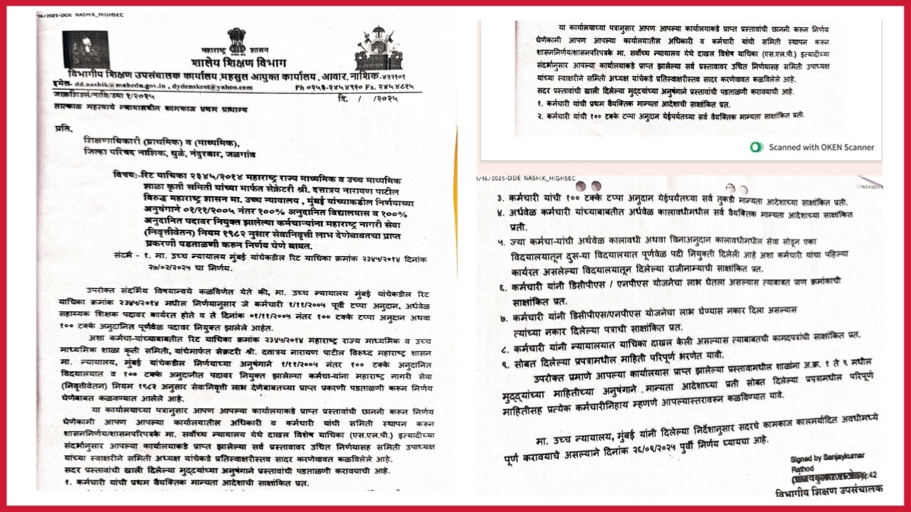 अशा कर्मचाऱ्यांबाबतीत रिट याचिका नुसार महाराष्ट्र राज्य माध्यमिक व उच्च माध्यमिक शाळा कृती समिती यांच्यामार्फत सेक्रटरी श्री.दत्तात्रय नारायण पाटी विरुद्ध महाराष्ट्र शासन मा.न्यायालय मुंबई यांच्याकडील निर्णयाच्या अनुषंगाने दि.01.11.2005 नंतर 100 टक्के अनुदानित विद्यालयात व 100 टक्के अनुदानित पदावर नियुक्त झालेल्या कर्मचाऱ्यांना …