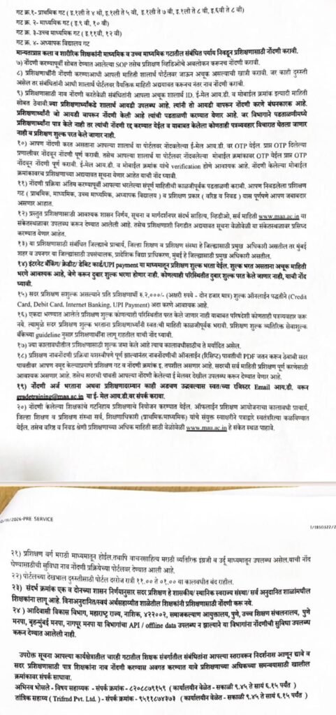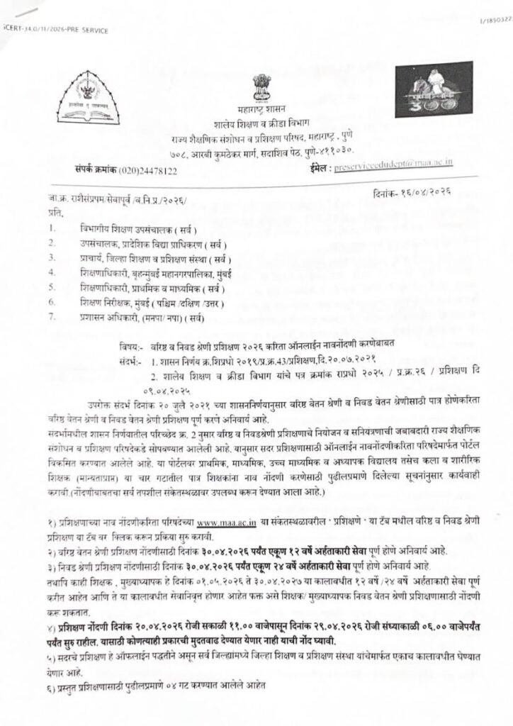 सदर परिपत्रकानुसार नमुद करण्यात आले आहेत कि , वरिष्ठ व निवड श्रेणी प्रशिक्षण 2026 नोंदणी करीता परिषदेच्या www.maa.ac.in या संकेतस्थळावर प्रशिक्षणे या टॅब वर क्लिक करुन वरिष्ठ व निवड श्रेणी प्रशिक्षण वर क्लिक करुन प्रक्रिया सुरु करण्याचे निर्देश देण्यात आले आहेत .