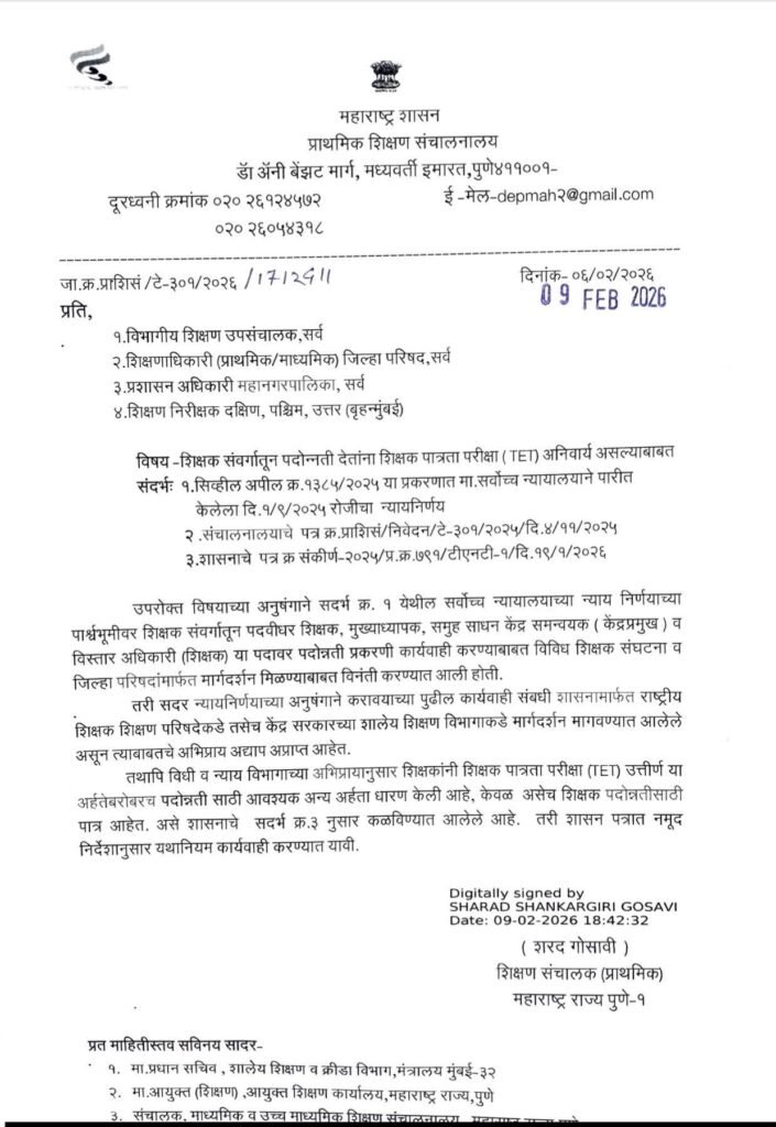 Mh-Tv@24 संगिता पवार प्रतिनिधी [ Important circular regarding Teacher Eligibility Test (TET) issued on 09.02.2026 ] : शिक्षक पात्रता परीक्षा ( TET) संदर्भात दि.09.02.2026 रोजी प्राथमिक शिक्षण संचालनालय मार्फत महत्वपुर्ण परिपत्रक निर्गमित करण्यात आलेला आहे .