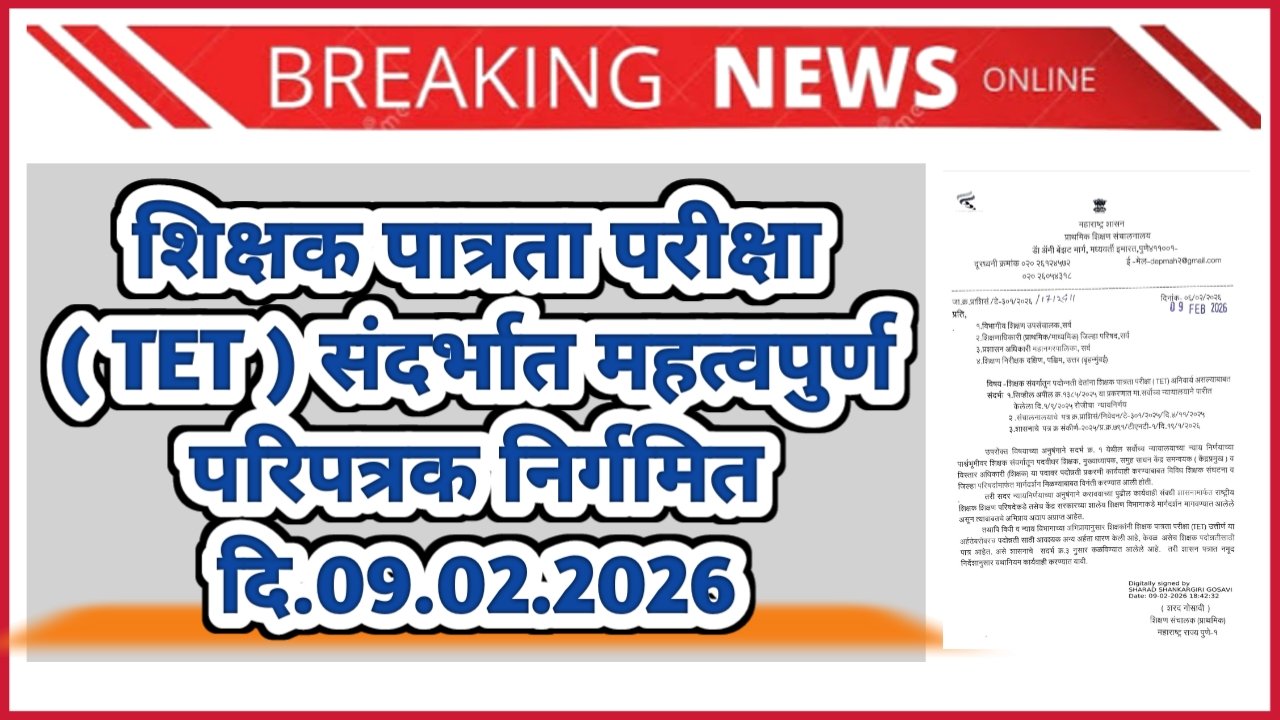 Mh-Tv@24 संगिता पवार प्रतिनिधी [ Important circular regarding Teacher Eligibility Test (TET) issued on 09.02.2026 ] : शिक्षक पात्रता परीक्षा ( TET) संदर्भात दि.09.02.2026 रोजी प्राथमिक शिक्षण संचालनालय मार्फत महत्वपुर्ण परिपत्रक निर्गमित करण्यात आलेला आहे .