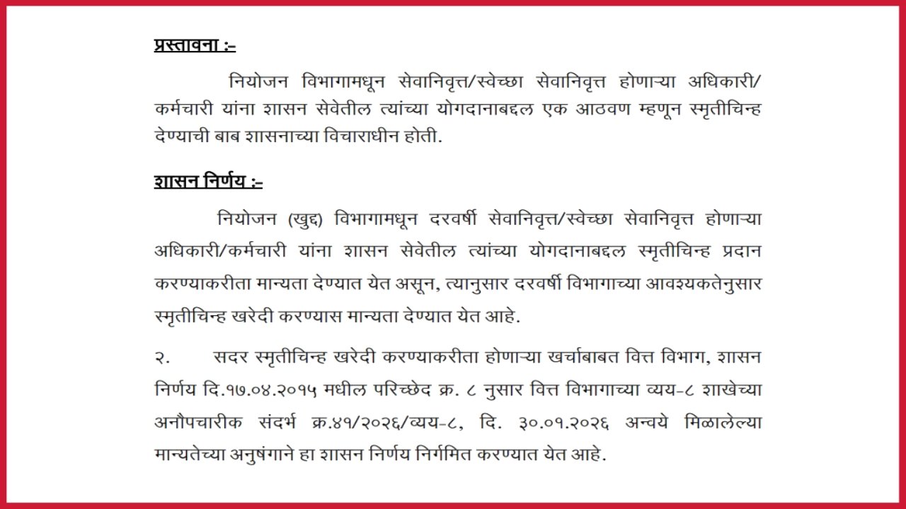 सदर शासन निर्णयानुसार नमुद करण्यात आले आहेत कि , सेवानिवृत्त / स्वेच्छा सेवानिवृत्त होणाऱ्या अधिकारी / कर्मचारी यांना शासन सेवेतील त्यांच्या योगदानाबद्दल एक आठवण म्हणून स्मृतीचिन्ह देण्याची बाब शासनांच्या विराचाधीन होती .