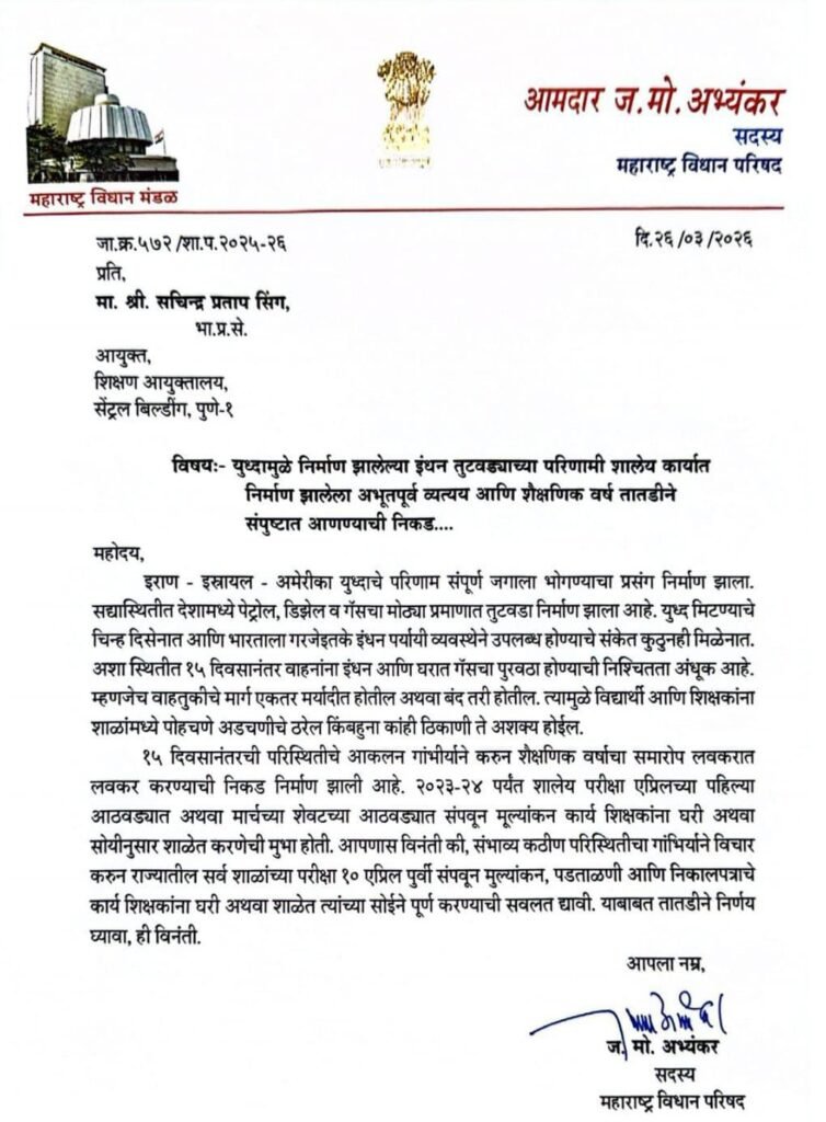 याकरीता राज्यातील शाळांना लवकरच सुट्टी देण्याकरीता आवश्यक ती कार्यवाही करणेबाबत आमदार ज.मो.अभ्यंकर सदस्य महाराष्ट्र विधान परिषद यांनी मा.श्री.सचिन्द्र प्रताप सिंग , भा.प्र.से आयुक्त शिक्षण आयुक्तालय , यांच्या प्रति निवेदन पत्र सादर केले आहेत .