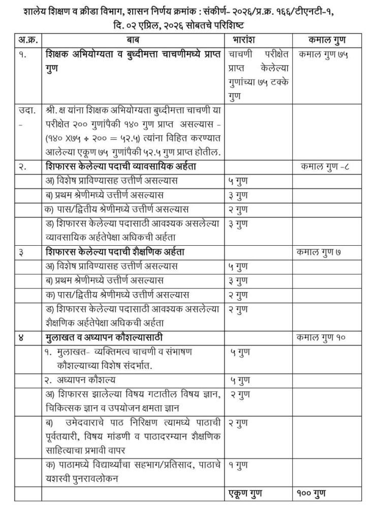 Mh-Tv@24 संगिता पवार प्रतिनिधी [ Marking procedure for recruitment of teachers in private educational institutions ] : खाजगी शैक्षणिक संस्था मध्ये शिक्षक पदभरती करीता गुणांकन कार्यपद्धती संदर्भात शालेय शिक्षण विभाग मार्फत दि.02.04.2026 रोजी महत्वपुर्ण शासन निर्णय निर्गमित करण्यात आला आहे .