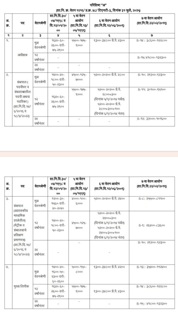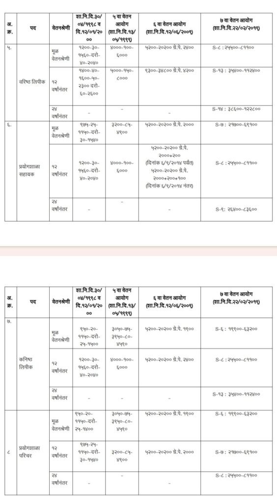 यांमध्ये अधिक्षक , ग्रंथपाल , मुख्य लिपिक , वरिष्ठ लिपिक , कनिष्ठ लिपिक , प्रयोगशाळा परिचर , नाईक , शिपाई या पदांसाठी आश्वासित प्रगती योजनेचा दुसरा लाभ बाबत सुधारित वेतनश्रेणी नमुद आहे . सविस्तर सुधारित वेतनश्रेणी तक्ता पुढीलप्रमाणे पाहु शकता ..