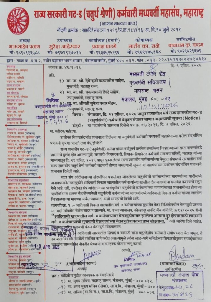 Mh-Tv@24 संगिता पवार प्रतिनिधी [ State Government Group ‘D’ (Class IV) employees go on an indefinite strike starting April 21. ] : राज्य सरकारी गट ड ( चतुर्थ श्रेणी ) कर्मचारी दि.21 एप्रिल पासुन बेमुदत संपावर जाणार आहेत . या संदर्भात राज्य सरकारी गट ड कर्मचारी मध्यवर्ती महासंघ मार्फत प्रसिद्धी पत्रक सादर करण्यात आले आहेत .