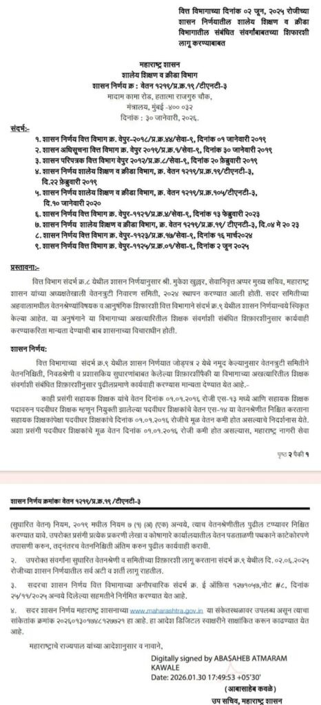 Mh-Tv संगीता पवार प्रतिनिधी [ GR issued on 30.01.2026 regarding implementation of revised pay scale ] : वेतन त्रुटी निवारण समितीने शिफारस केलेल्या सुधारित वेतनश्रेणी लागू करणे संदर्भात , शालेय शिक्षण व क्रीडा विभागाकडून दिनांक 30 जानेवारी 2020 रोजी महत्त्वपूर्ण शासन निर्णय निर्गमित करण्यात आलेला आहे .