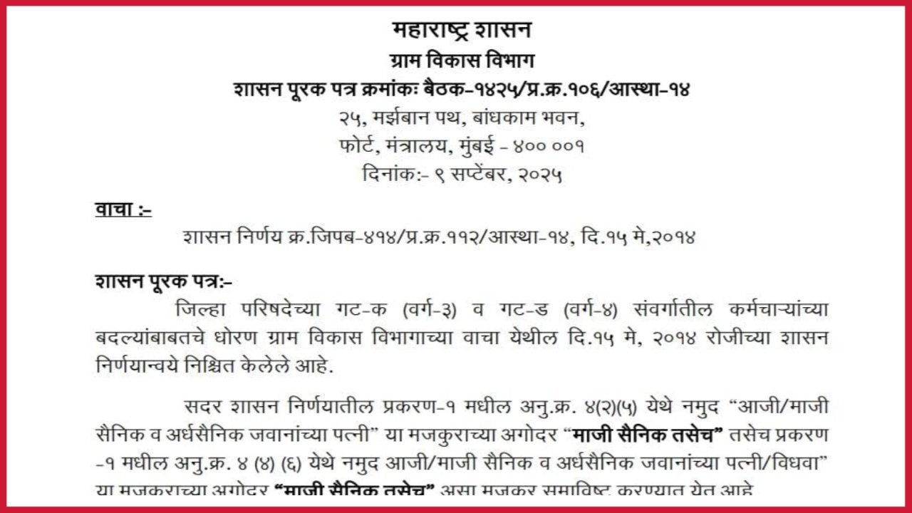 ZP : गट क व गट ड संवर्गातील कर्मचाऱ्यांचे बदली धोरणांमध्ये सुधारणा GR निर्गमित दि.09.09.2025