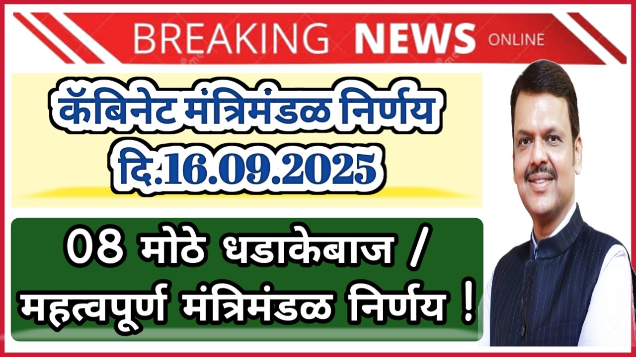 मंत्रीमंडळ बैठक : दिनांक 16 सप्टेंबर रोजी झालेल्या कॅबिनेट बैठकीत घेण्यात आले 08 मोठे महत्वपुर्ण मंत्रीमंडळ निर्णय !