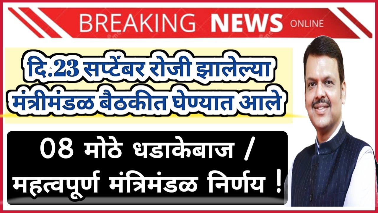 दि.23 सप्टेंबर रोजी झालेल्या मंत्रीमंडळ बैठकीत घेण्यात आले 08 मोठे महत्वपुर्ण कॅबिनेट निर्णय !