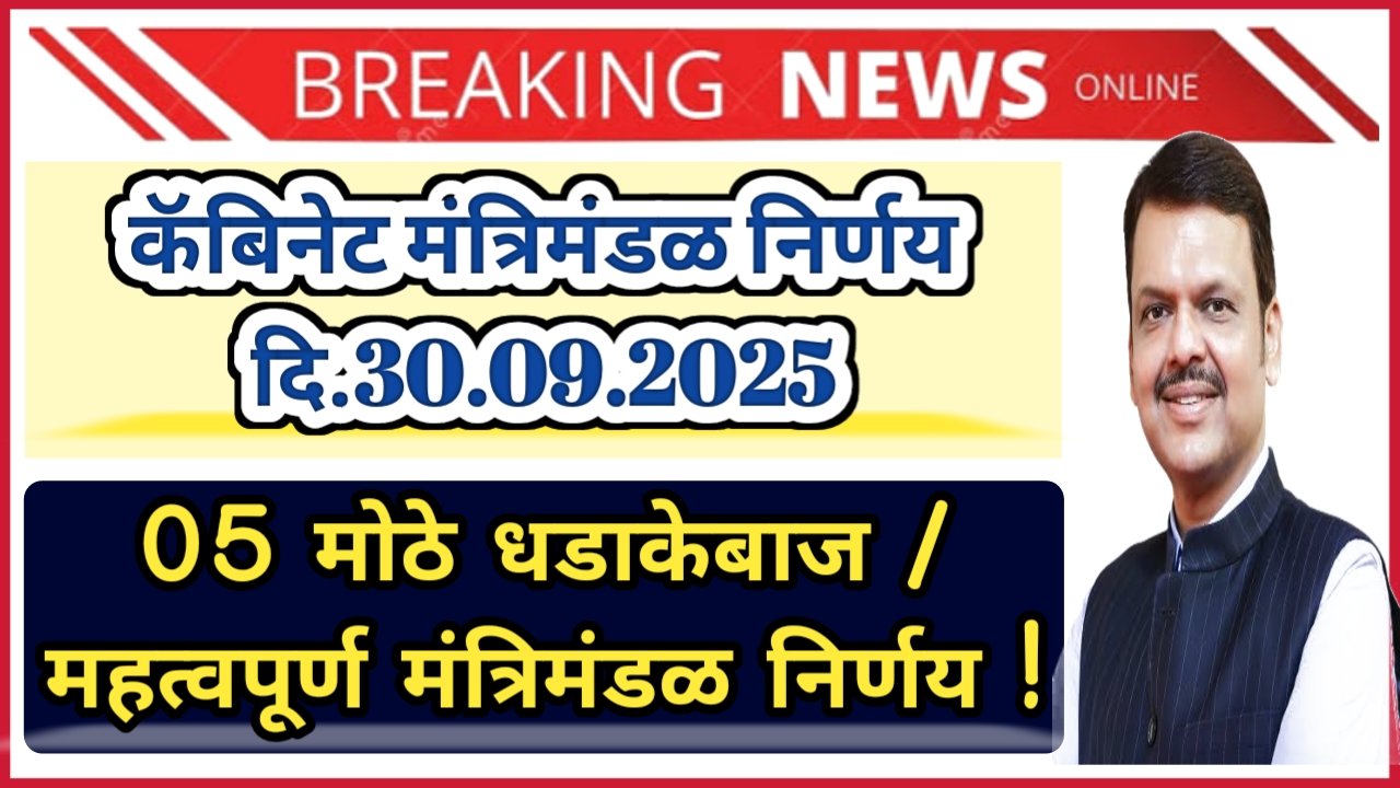 दि.30 सप्टेंबर रोजी झालेल्या मंत्रीमंडळ बैठकीत घेण्यात आले 05 मोठे महत्वपुर्ण कॅबिनेट निर्णय !