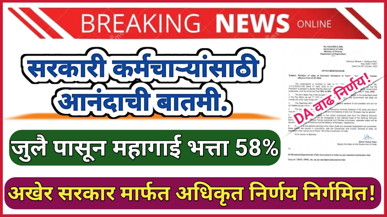 DA : सरकारी कर्मचाऱ्यांच्या डी.ए मध्ये 3% वाढ ( 55% वरुन 58% ) ; अखेर अधिकृत्त निर्णय निर्गमित दि.06.10.2025